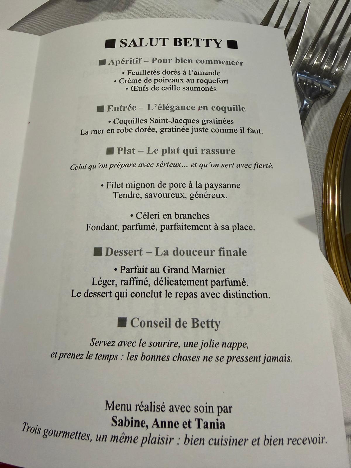 Bernadette devait être là, aux côtés de Chantal et Sabine, pour imaginer et façonner ce menu-hommage. Le sort — sous la forme d’un virus aussi sournois qu’un engrenage grippé — en a décidé autrement. Clouée au lit, absente physiquement… mais omniprésente artistiquement.